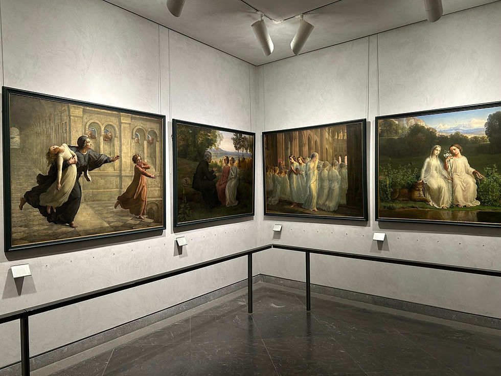 Eine echte Entdeckung sind Louis Janmots 18 Gemälde, die er für die Weltausstellung in Paris 1855 geschaffen hat. Die Serie trägt den Titel „Le Poème de l’âme“ und erzählt die spirituelle Reise einer jungen Seele von der Kindheit bis zur Vereinigung mit dem Göttlichen. Alle Bilder sind im gleichen Format gehalten und folgen einer chronologischen Reihenfolge, sodass sich die Geschichte Schritt für Schritt entfaltet.